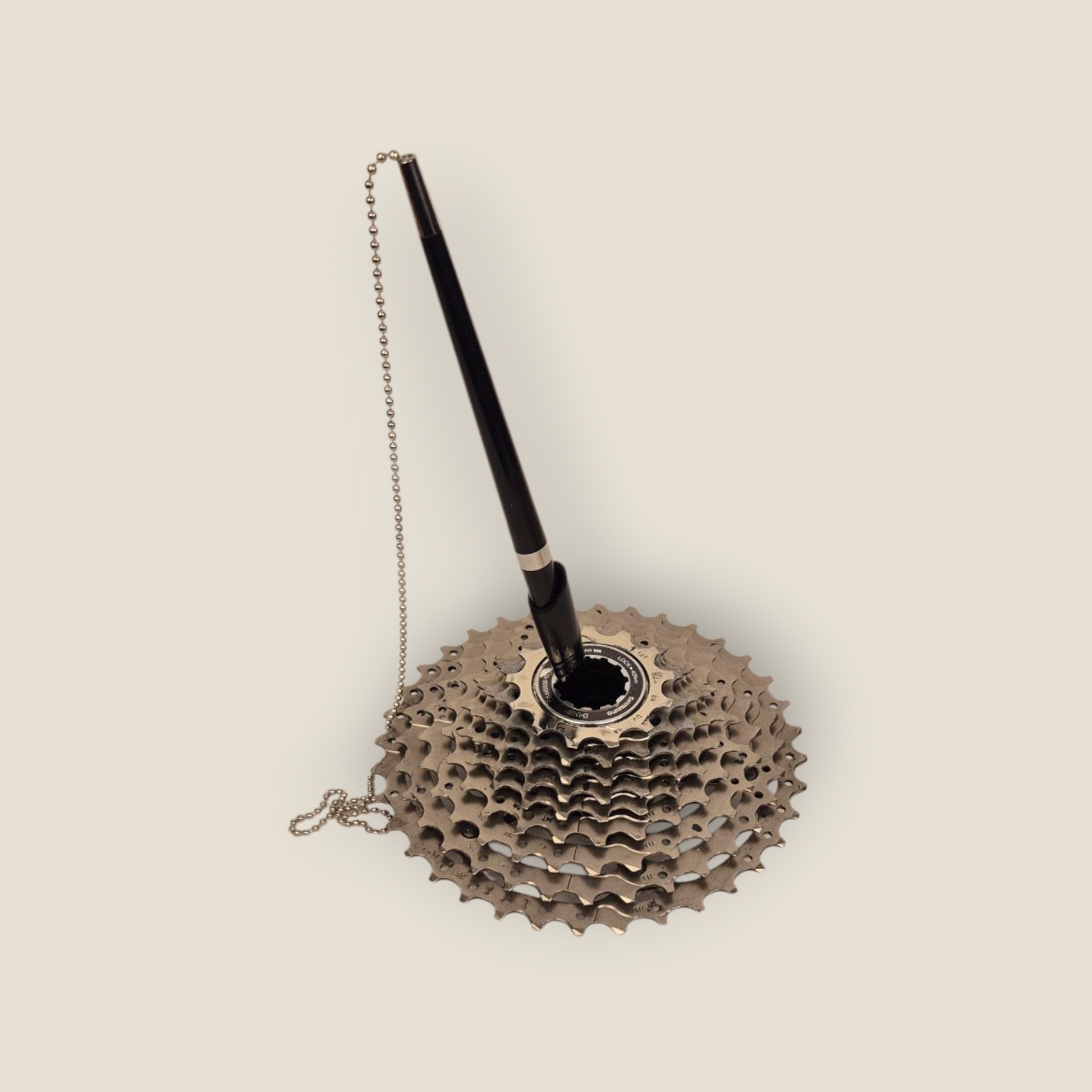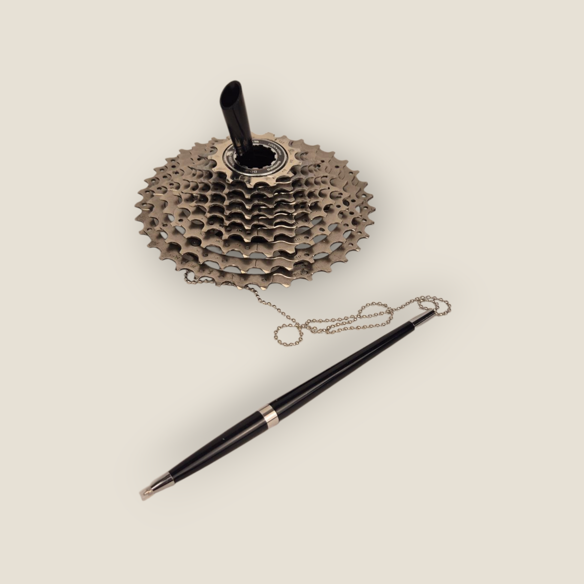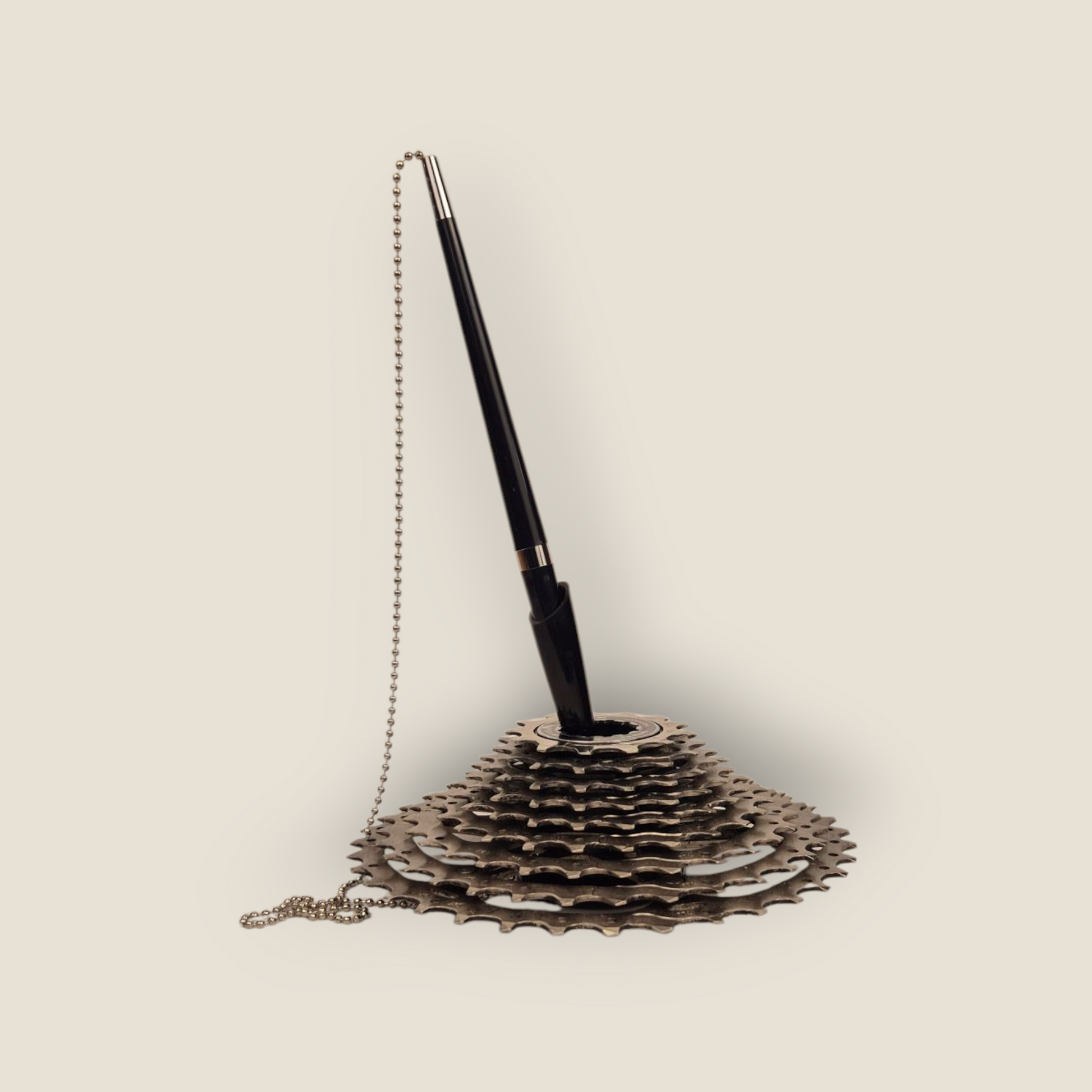 Discover the perfect combination of sustainability and creativity with our exclusive counter pen, made from recycled old bicycle wheels. Each pen is a unique piece of craftsmanship, designed for lovers of innovation and environmentally conscious design.